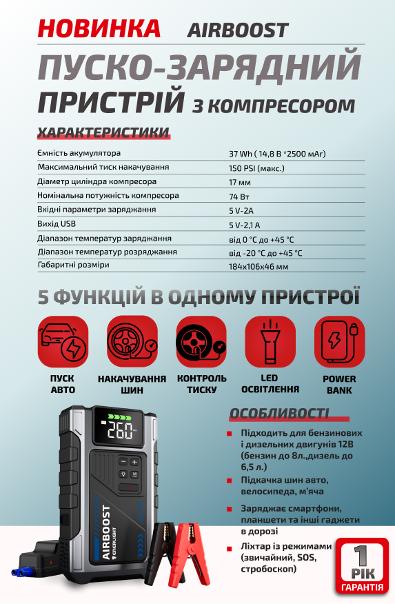 Ідеальне рішення для водіїв, яке допоможе впоратись із розрядженим акумулятором та підтримувати оптимальний тиск у шинах у будь-якій ситуації.